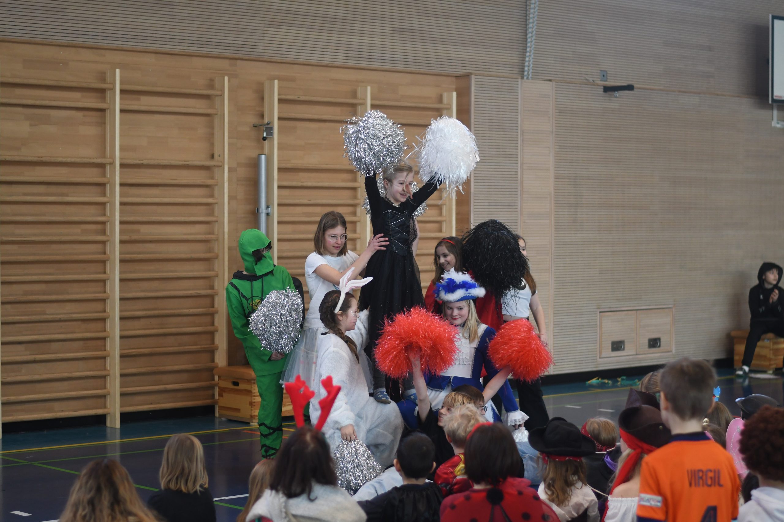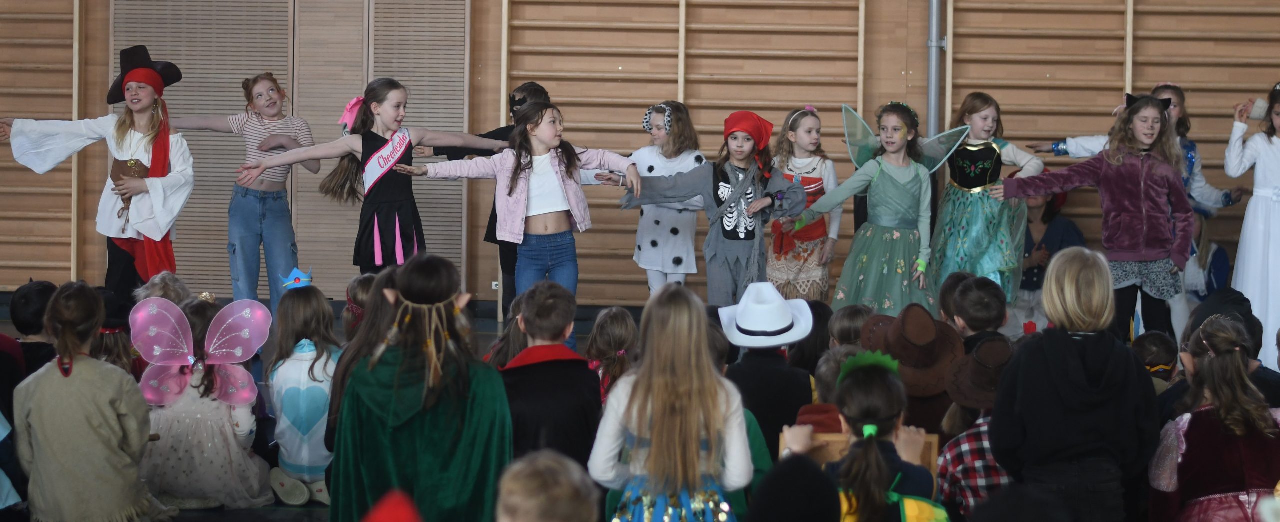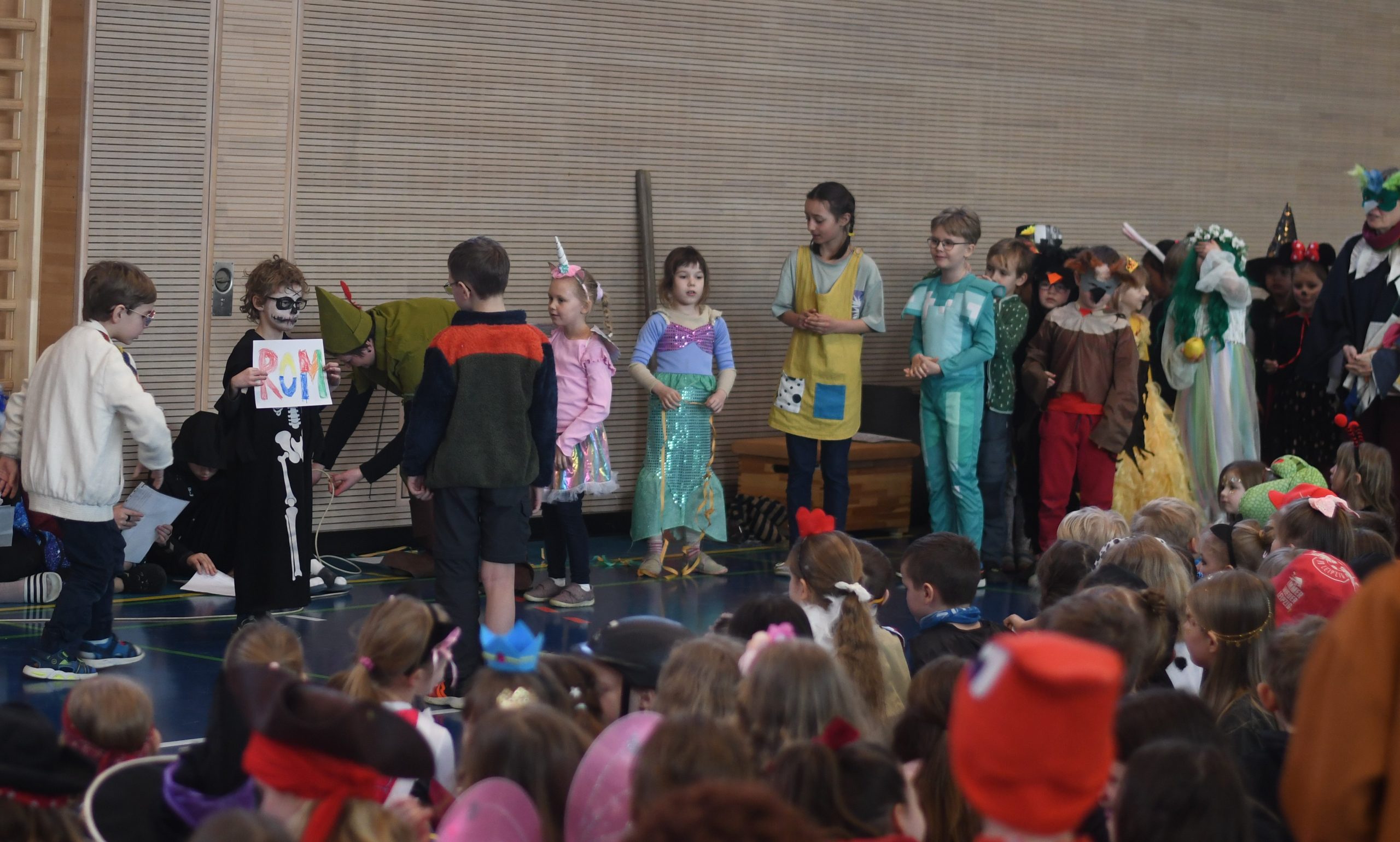 Am Faschingsdienstag feierten die Kinder der Jahrgangsstufen 1 bis 6 ein beschwingtes Fest. Mit einer riesenlangen Polonaise ging es durchs ganze Schulhaus in die Mehrzweckhalle. Dort erlebten wir ein ca. einstündiges Programm. Jede Stammgruppe hatte dafür einen Beitrag vorbereitet. Josephine führte mit Momo, Tyler und Lilli-Sue durchs Programm und sorgten für die richtige Stimmung.