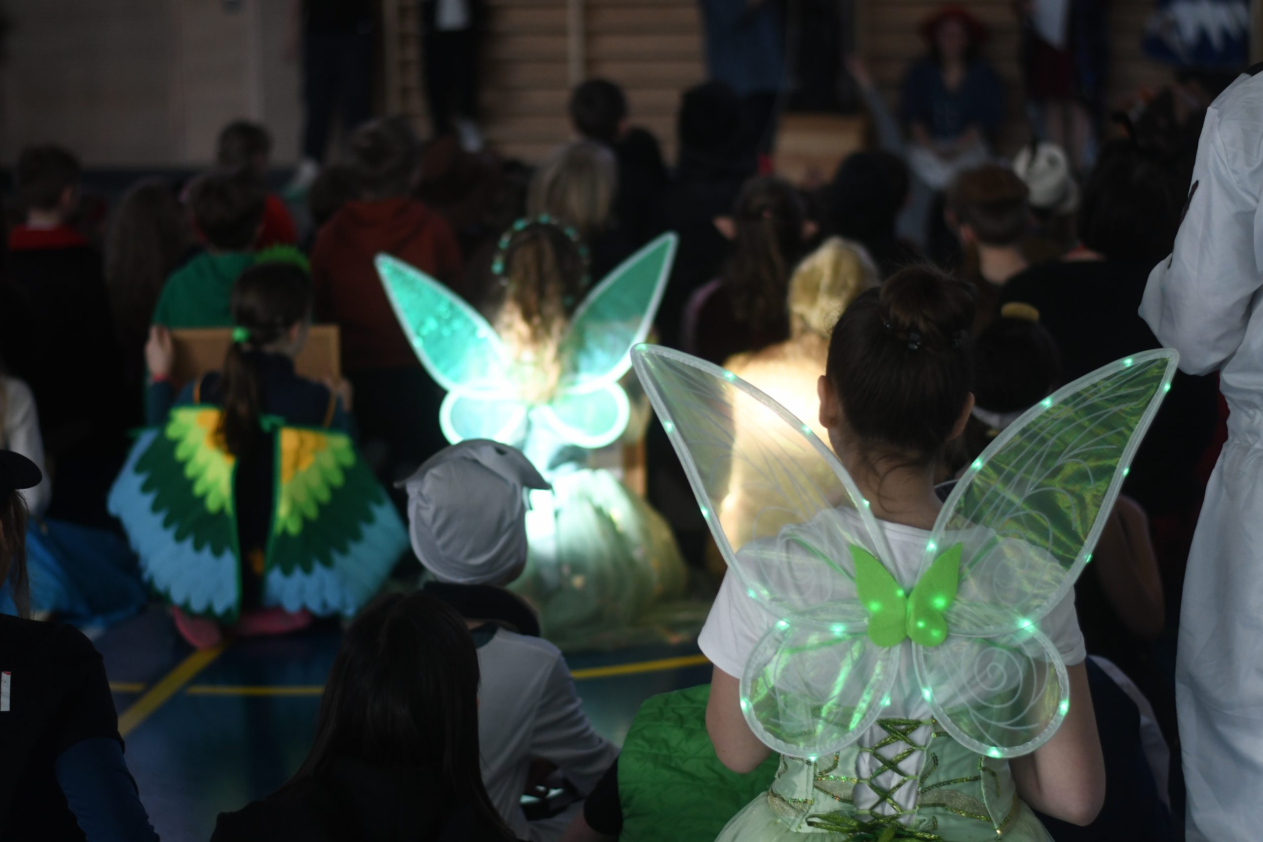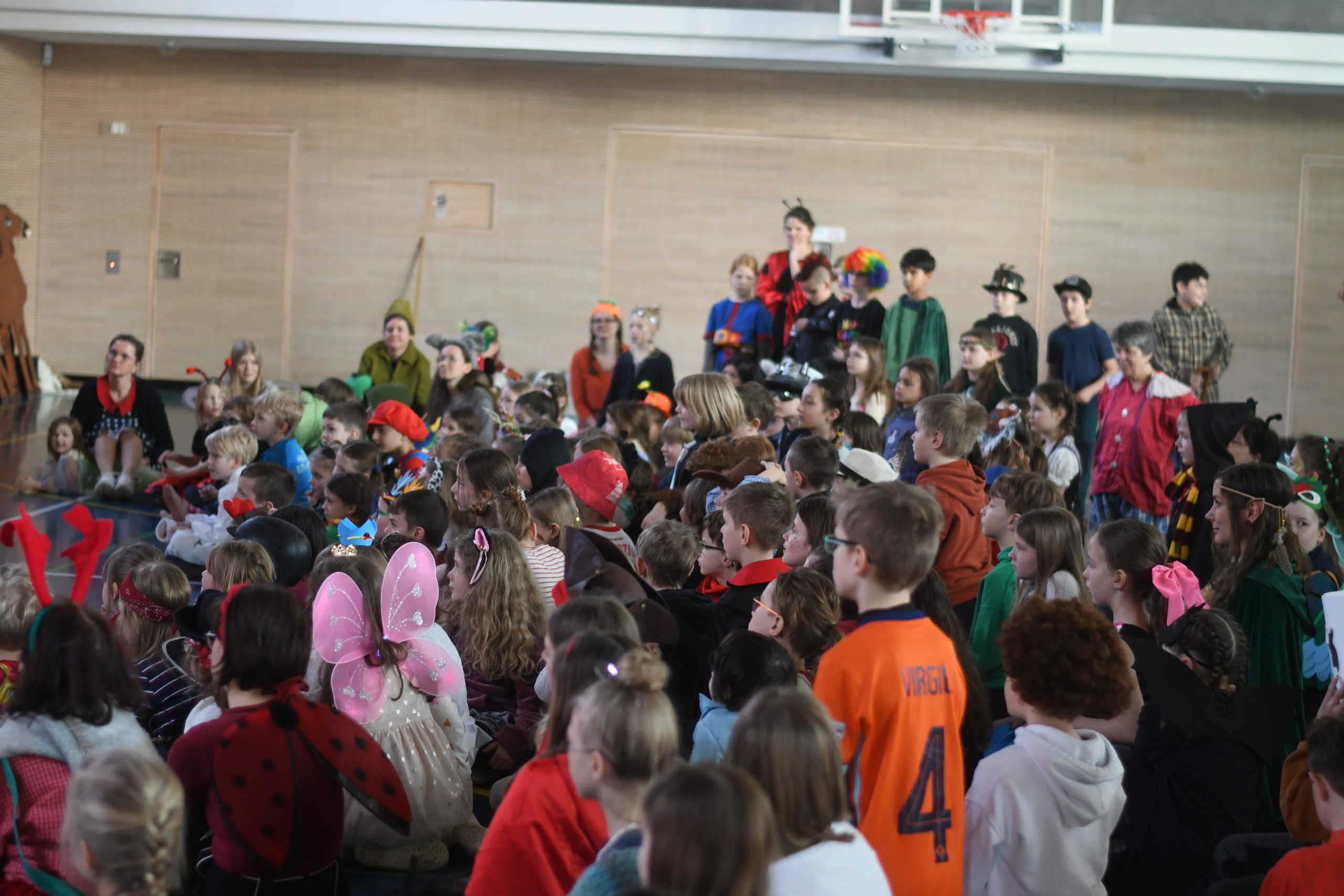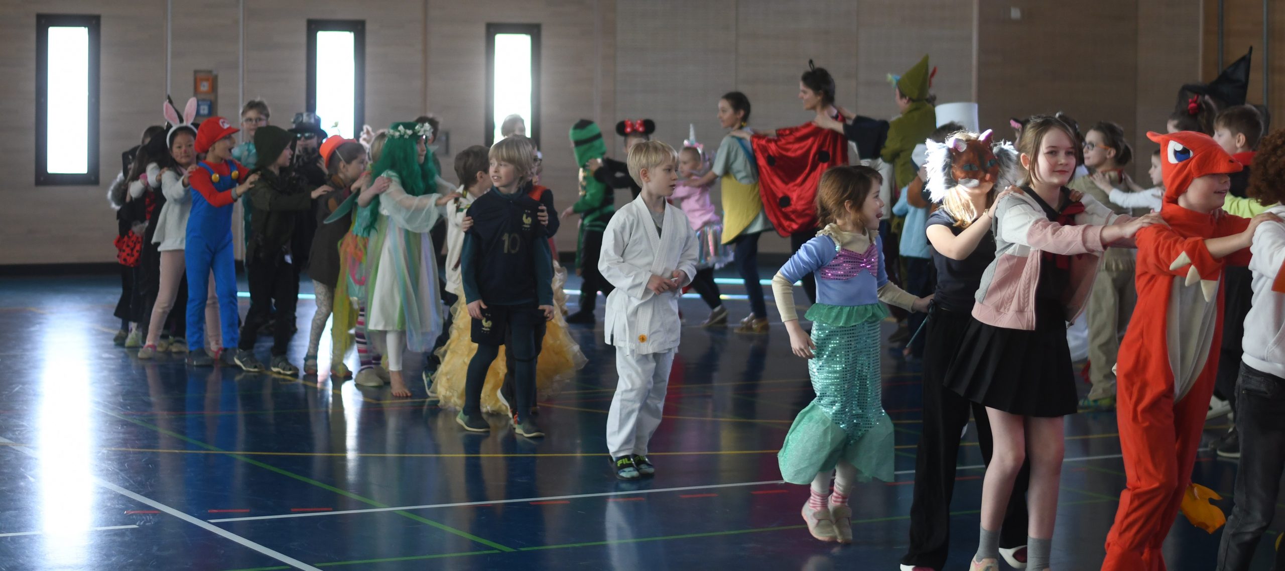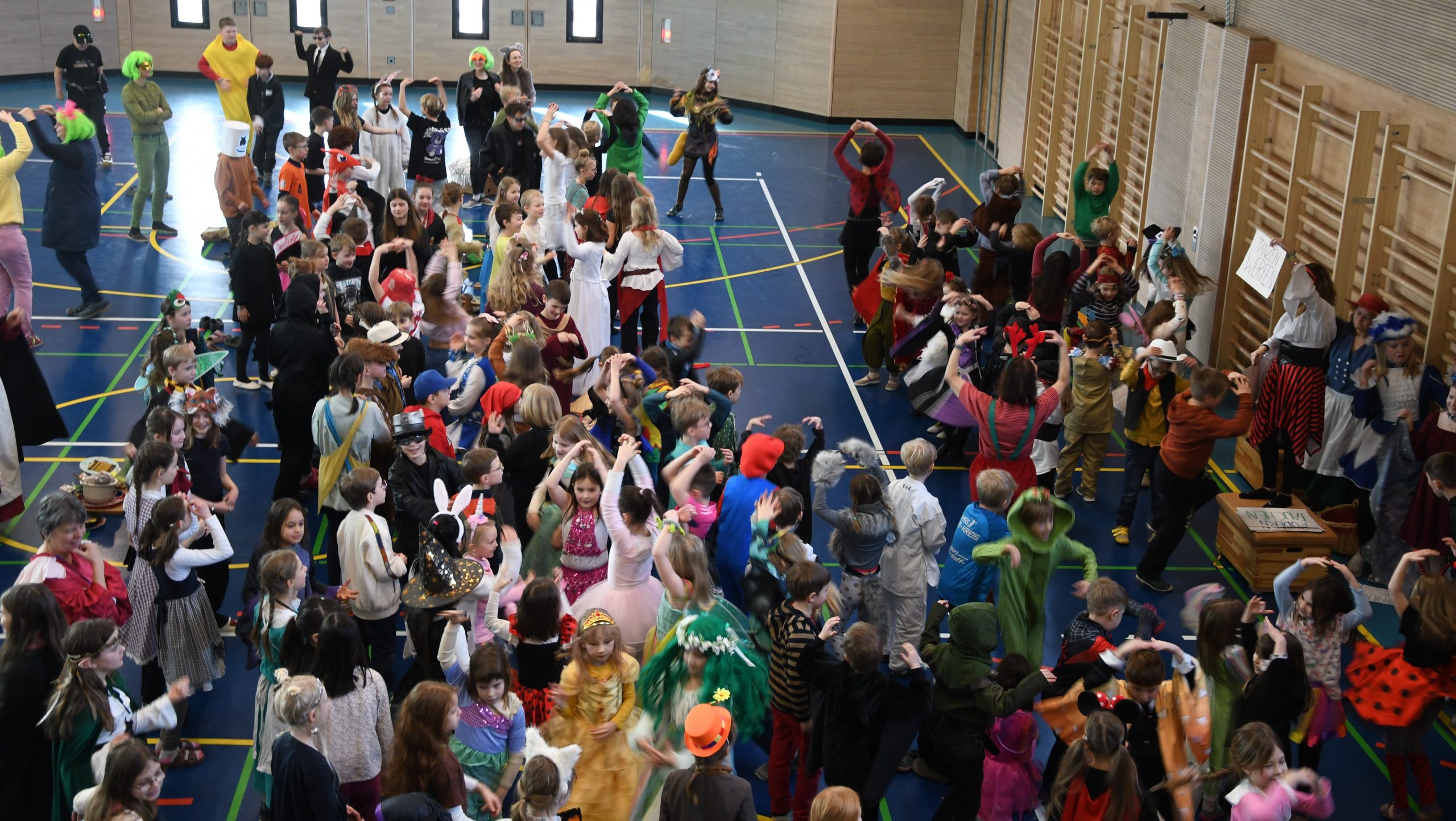 Am Faschingsdienstag feierten die Kinder der Jahrgangsstufen 1 bis 6 ein beschwingtes Fest. Mit einer riesenlangen Polonaise ging es durchs ganze Schulhaus in die Mehrzweckhalle. Dort erlebten wir ein ca. einstündiges Programm. Jede Stammgruppe hatte dafür einen Beitrag vorbereitet. Josephine führte mit Momo, Tyler und Lilli-Sue durchs Programm und sorgten für die richtige Stimmung.