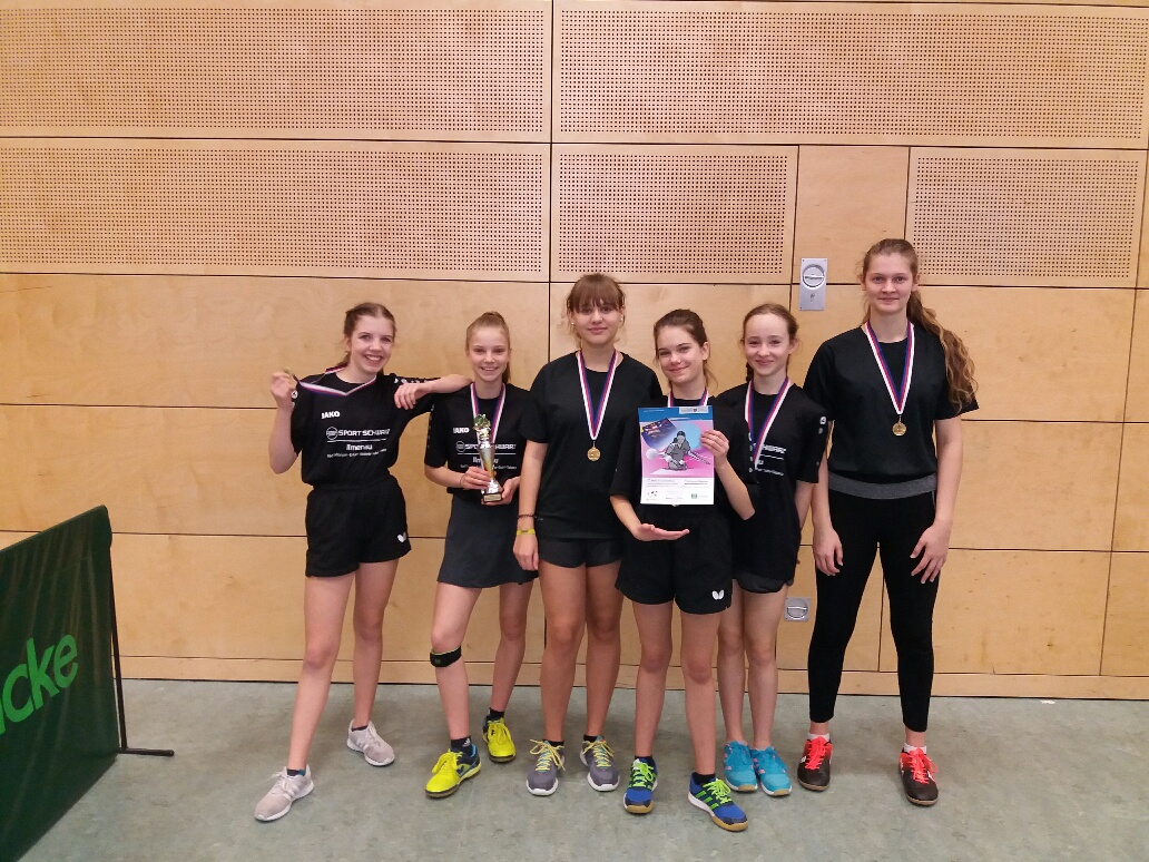 Wir konnten zunächst das Tischtennis-Turnier für den Bereich der Ilmenauer Schulen klar für uns entscheiden. Die zweite Runde im Schulamtsfinale Westthüringen musste ausfallen, weil wir keine Gegner hatten. Somit waren wir für das Landesfinale qualifiziert. Das fand am 28.02.2019 in Sonneberg statt. Wir trafen auf die Mannschaften von Apolda, Schwarza und Neuhaus. Dort haben wir jedes Spiel gewonnen, so dass wir uns für das Bundesfinale in Berlin qualifiziert haben. Das findet vom 07.05. – 11.05.2019 statt, auf das wir uns riesig freuen. ( Text: Charlotte Vogel)