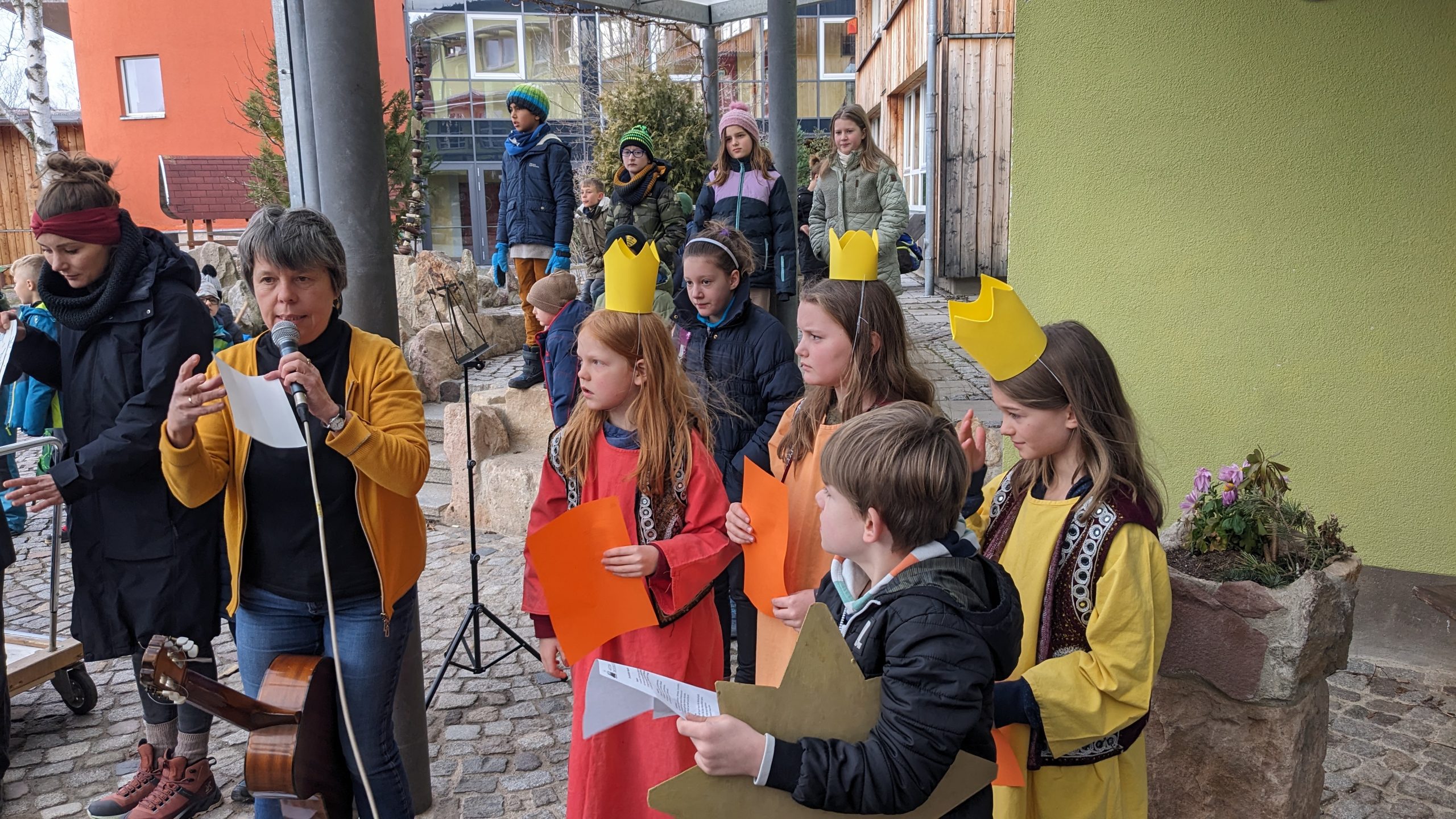 Im vorangegangenen Montagmorgenkreis erfuhren die Kinder, warum die Sternsinger von Haus zu gehen. Kinder sammeln für Kinder, damit es ihnen weltweit gut geht. In diesem Jahr lautet das Motto: „Erhebt eure Stimme! Für Kinderrechte“.
