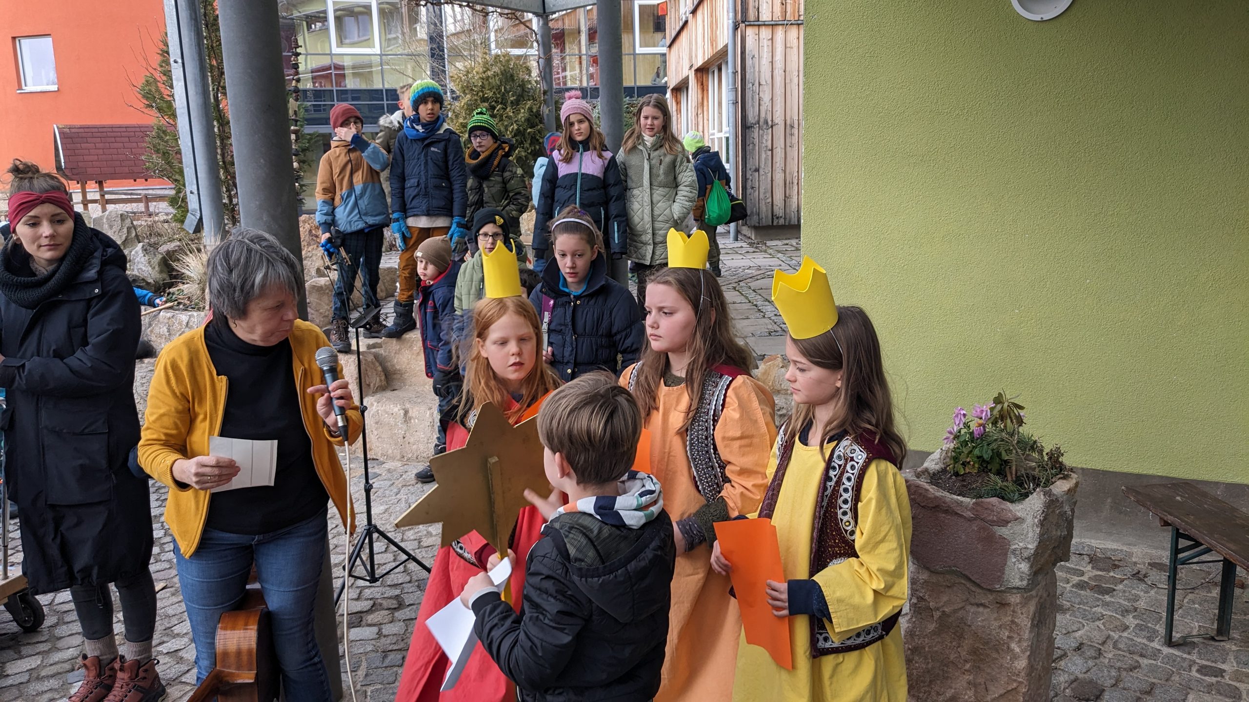 Am Montag, dem 06.01. – dem Dreikönigstag – waren die Sternsinger bei uns und überbrachten den Segen für alle Menschen, die im Schulhaus ein- und ausgehen. Alle Kinder hörten gespannt den Versen der drei Könige und des Sternträgers zu. Gemeinsam sangen wir das Lied „Könige aus Morgenland“.