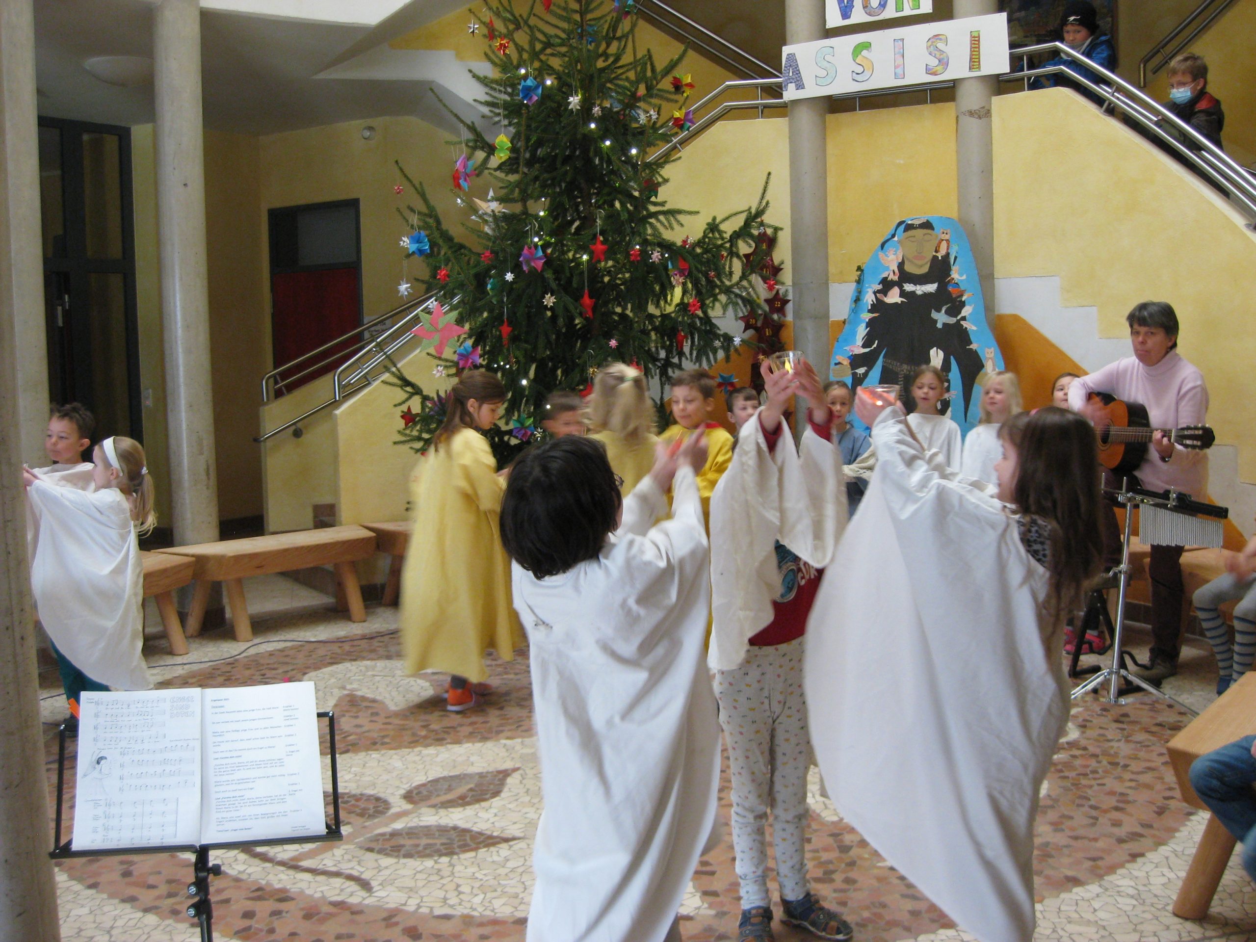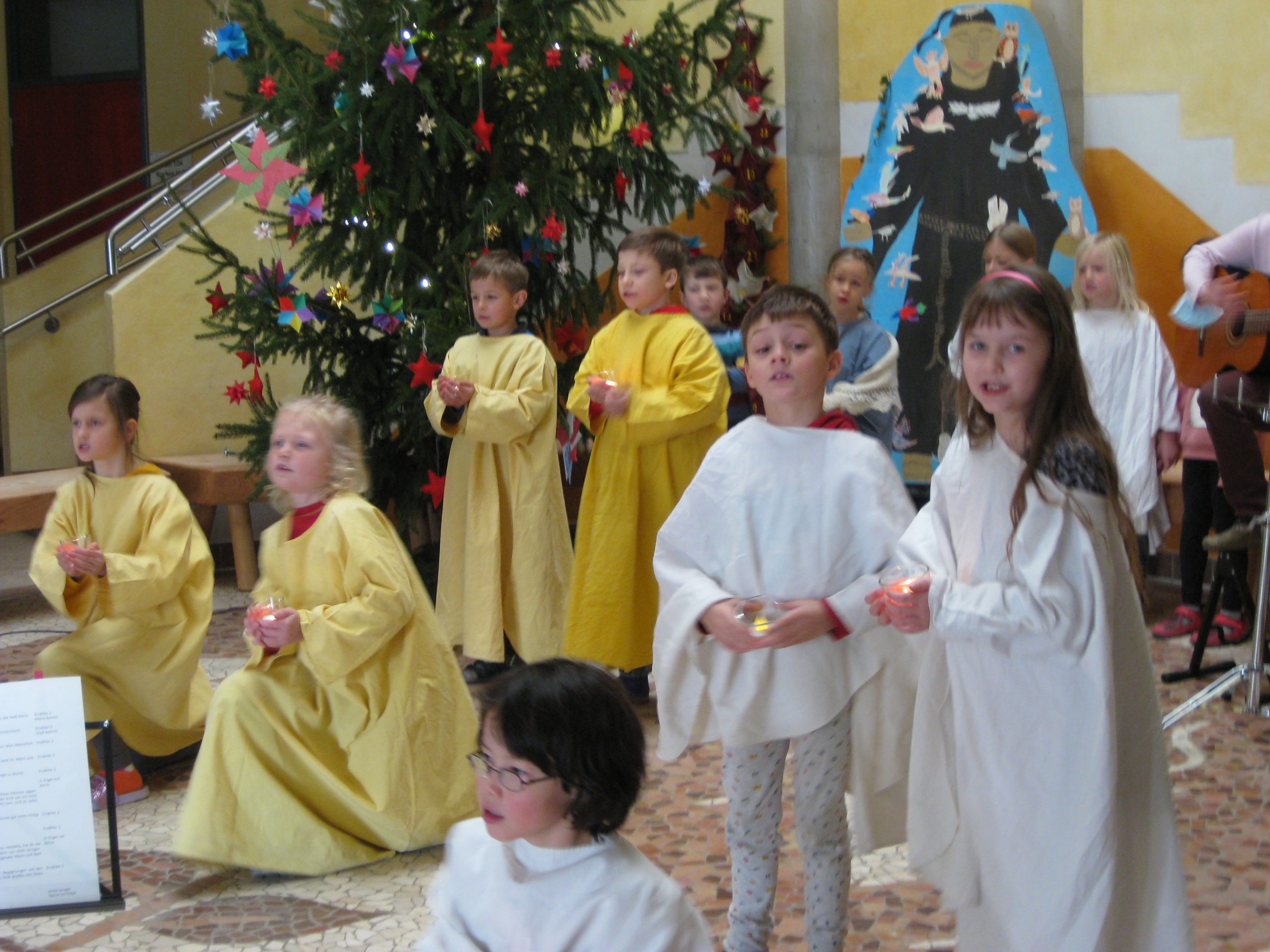 Ganz engelhaft klingen die Lieder, die mit viel Eifer vorbereitet und mit Lampenfieber aufgeführt werden. Auch die Weihnachtsgeschichte wird jede Woche Stück für Stück erzählt. An der aufgestellten Weihnachtskrippe in der Bibliothek verändert sich Woche für Woche etwas: Heute kamen Maria, Josef und die Engel dazu.