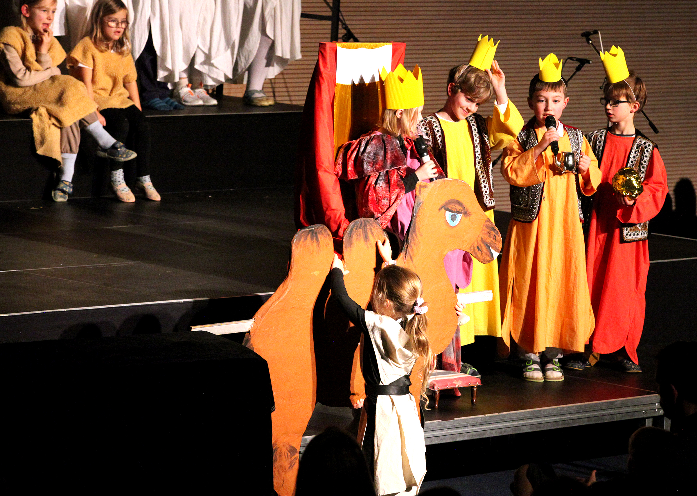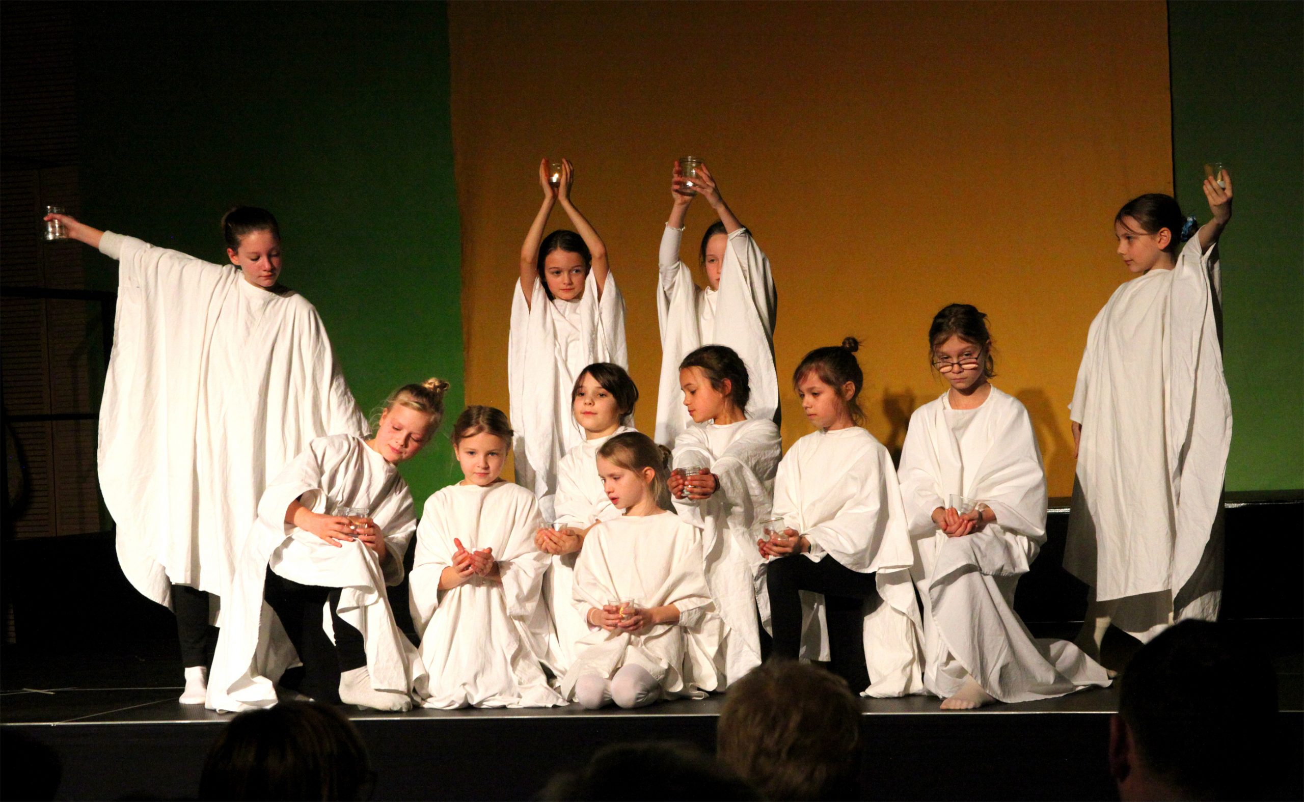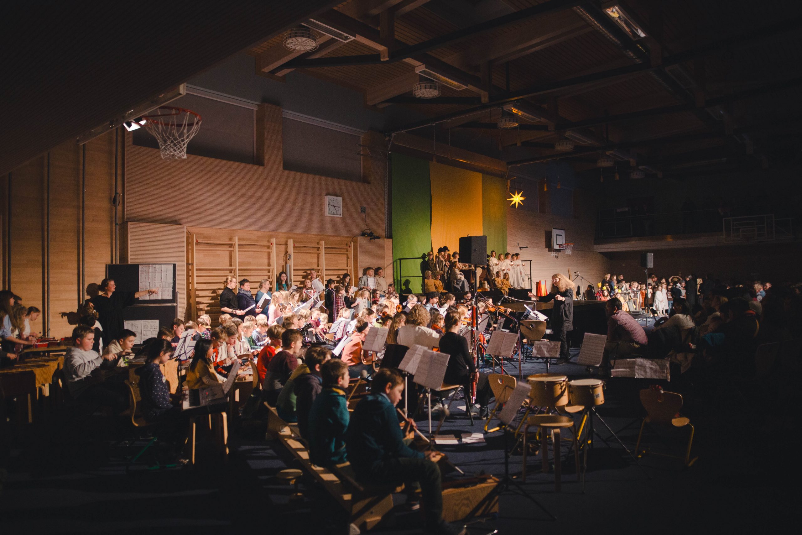 In den letzten 3 Wochen studierten die ca. 60 Orchesterkinder ihre Stücke ein, damit das Miteinanderspielen gut klappen wird. Die Schauspieler*innen der Stammgruppen 1/2 und 5/6 probten ihre Szenen und verwandelten sich so mehr und mehr in Maria, Josef, Wirtsleute, Hirten, Schafe und die heiligen drei Könige sowie König Herodes. Die Schüler*innen der Jahrgänge 9 – 13 übten im Projektchor und sogar einige Pädagog*innen erweiterten diesen Chor beim Lied „Carol of the bells“.
