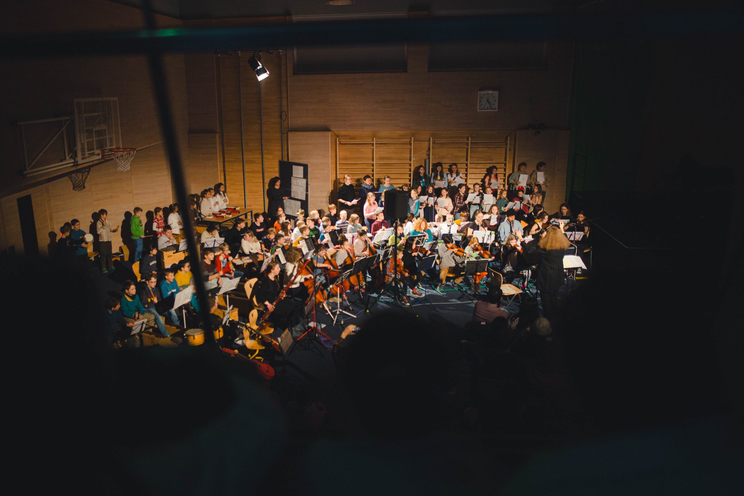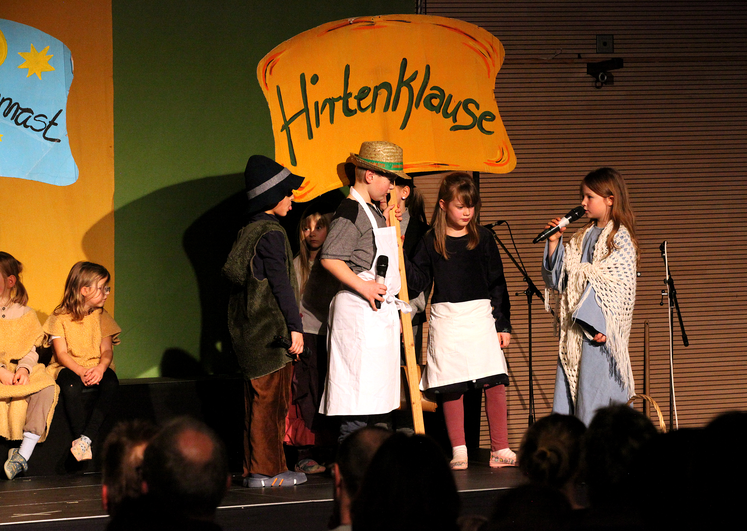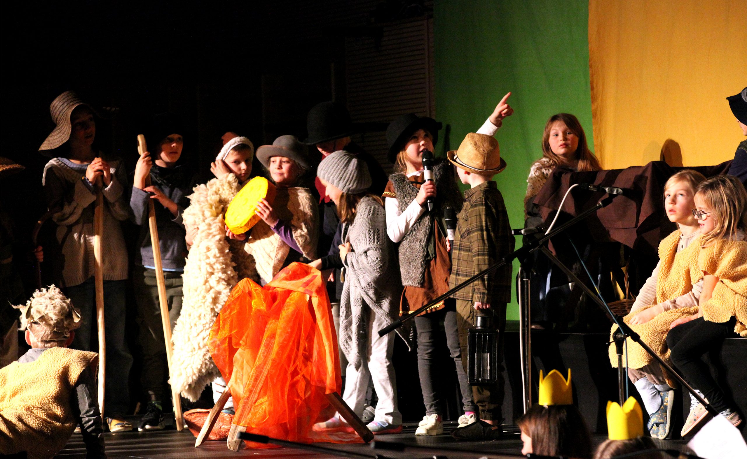 In den letzten 3 Wochen studierten die ca. 60 Orchesterkinder ihre Stücke ein, damit das Miteinanderspielen gut klappen wird. Die Schauspieler*innen der Stammgruppen 1/2 und 5/6 probten ihre Szenen und verwandelten sich so mehr und mehr in Maria, Josef, Wirtsleute, Hirten, Schafe und die heiligen drei Könige sowie König Herodes. Die Schüler*innen der Jahrgänge 9 – 13 übten im Projektchor und sogar einige Pädagog*innen erweiterten diesen Chor beim Lied „Carol of the bells“.