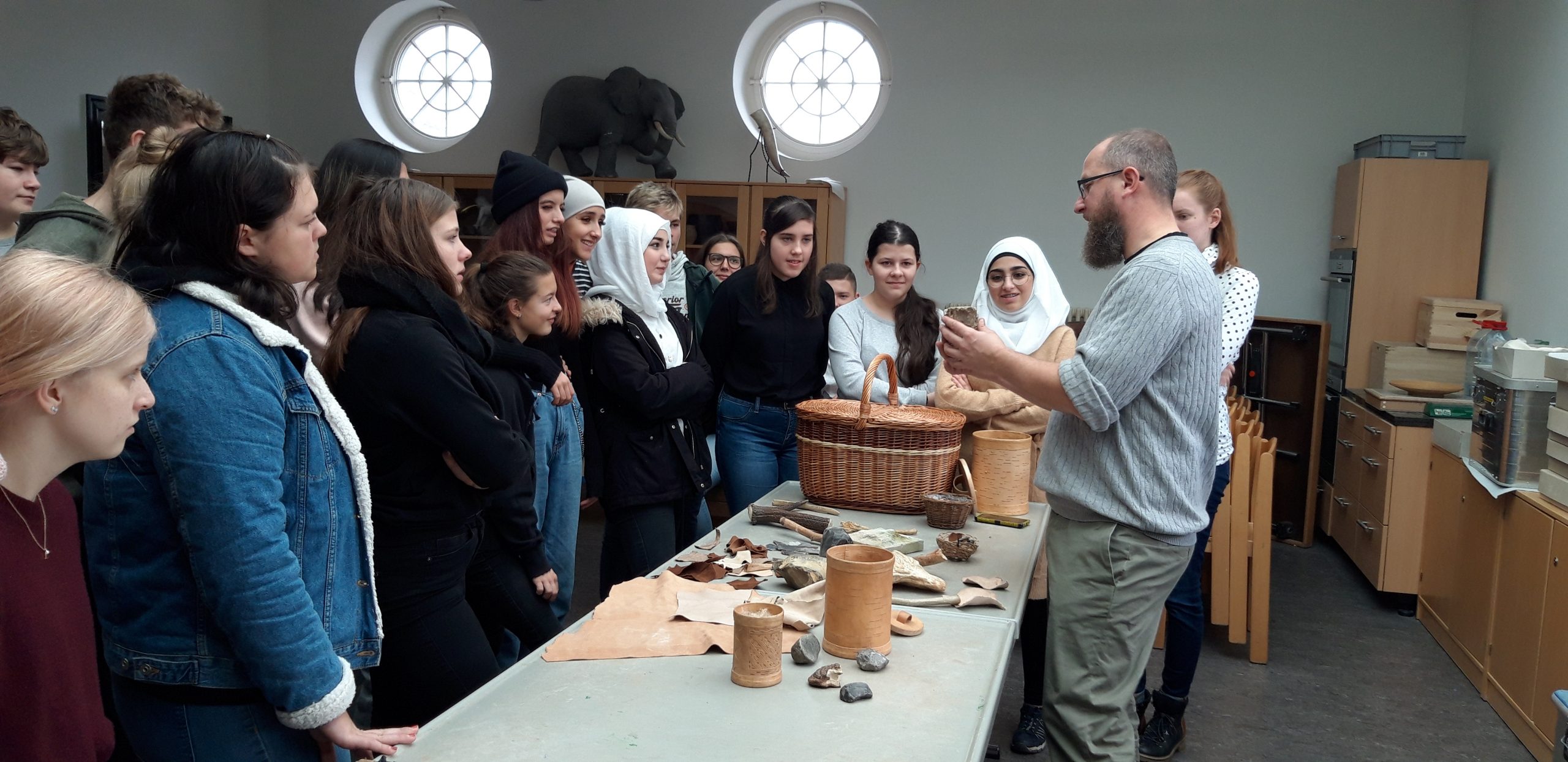 Am Freitag, dem 22.11.19, besuchten die Schülerinnen und Schüler der Jahrgangsstufe 9/10 im Rahmen der Epoche zum Thema „Evolution“ das Landesmuseum für Ur- und Frühgeschichte in Halle an der Saale. Neben der berühmten Himmelsscheibe von Nebra, die dort ausgestellt ist, konnten die Schüler*innen verschiedene Funde aus der Steinzeit betrachten. Wie die Hominiden lebten, wurde bei der Führung durch die Ausstellung teilweise deutlich. Anschaulich und praktisch bekamen die Schüler*innen dann einen Einblick in den Alltag der Hominiden, indem ihnen gezeigt wurde, wie diese Feuer machten. Anschließenden konnten sie selbst wie ein Hominid mit einem Feuerstein Leder durchtrennen. Leider war die Zeit zu knapp, um sich die gesamte Ausstellung anzuschauen und noch tiefer in die Geschichte unserer Vorfahren einzutauchen.