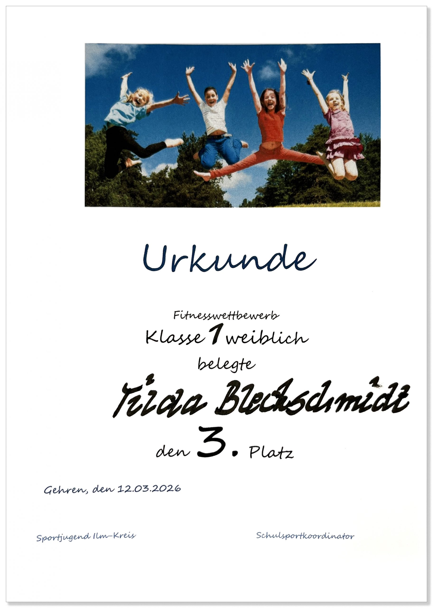 Am Donnerstag, dem 12.03.2026, nahmen insgesamt 8 Schüler*innen (jeweils zwei Kinder der 1. bis 4. Jahrgangsstufe) unserer Schule am Fitnesswettbewerb der Grundschulen teil. Der Wettkampf fand in der Turnhalle in Plaue statt. Von insgesamt 16 Schulen waren zum Wettbewerb 14 Schulen vor Ort und konnten sich in spannenden Wettkämpfen miteinander messen.