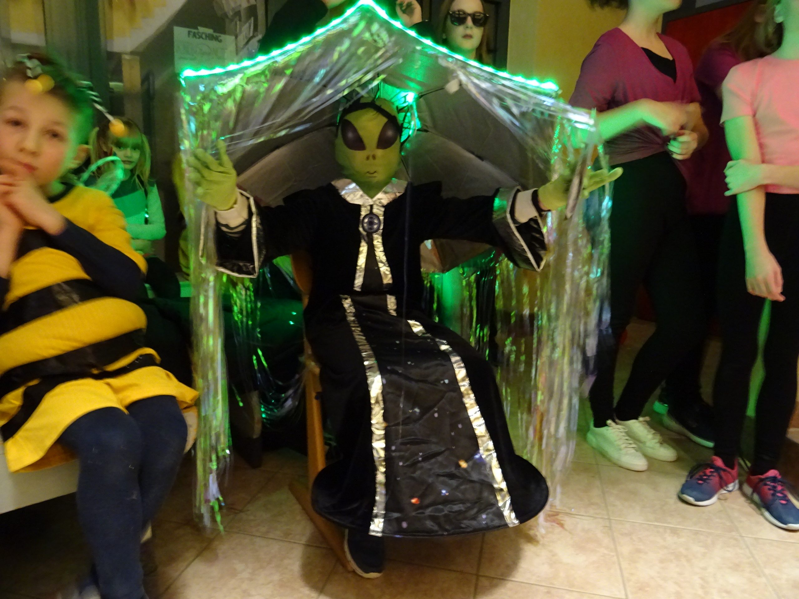Beim Programm haben vier Jungs der Feuergruppe ihren selbst ausgedachten Breakdance vorgeführt. Auch acht Mädels der Primarstufe haben mit ihrem Squaredance das Publikum begeistert. Die Mädels der 7/8er haben mit ihrem Tanz „just dance“ gezeigt, was sie im Wahlsport im vergangenen Halbjahr gelernt haben. Die „Bildungsministerin Elfride von Glasen“ kam zu Besuch und hat Lob ausgesprochen, aber auch wichtige Dinge, wie den Umgangston unter den Schülern und den Handykonsum der größeren Schüler, bemängelt. Abgerundet wurde das Programm mit der Wahl des besten Kostüms. Gewonnen hat Alek aus der Feuergruppe mit seinem selbst kreierten Alienkostüm.