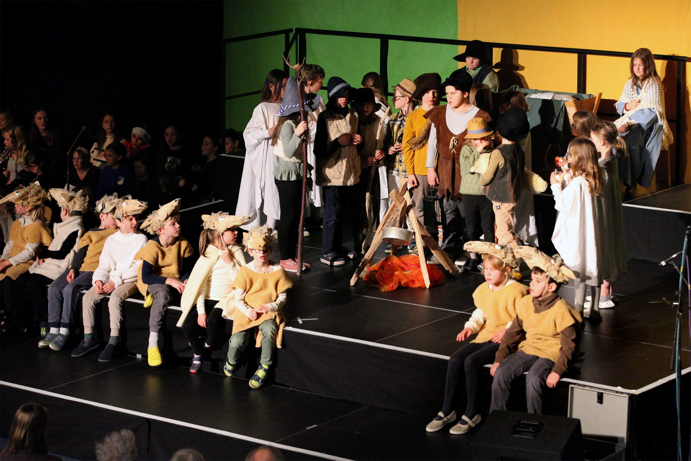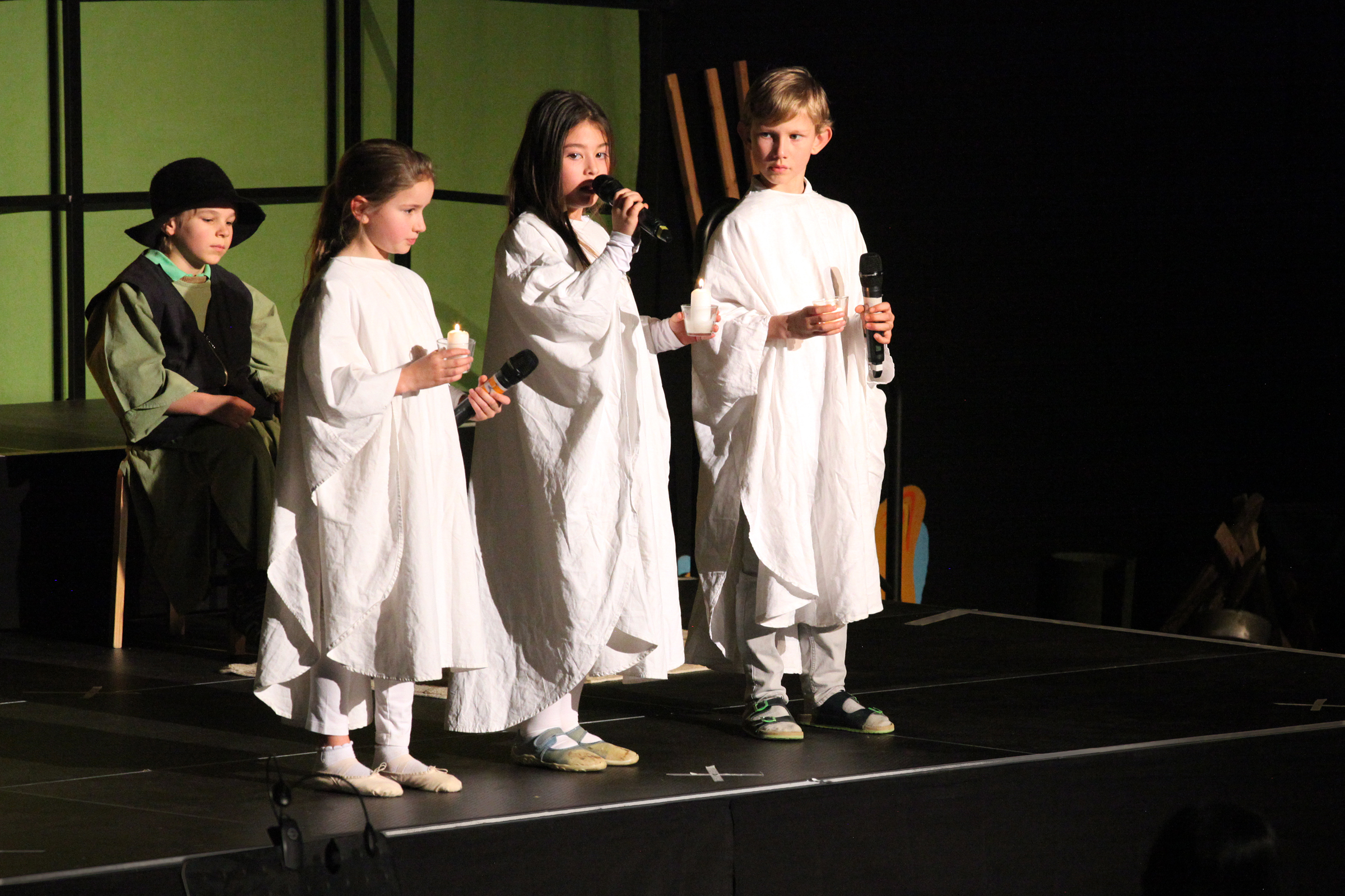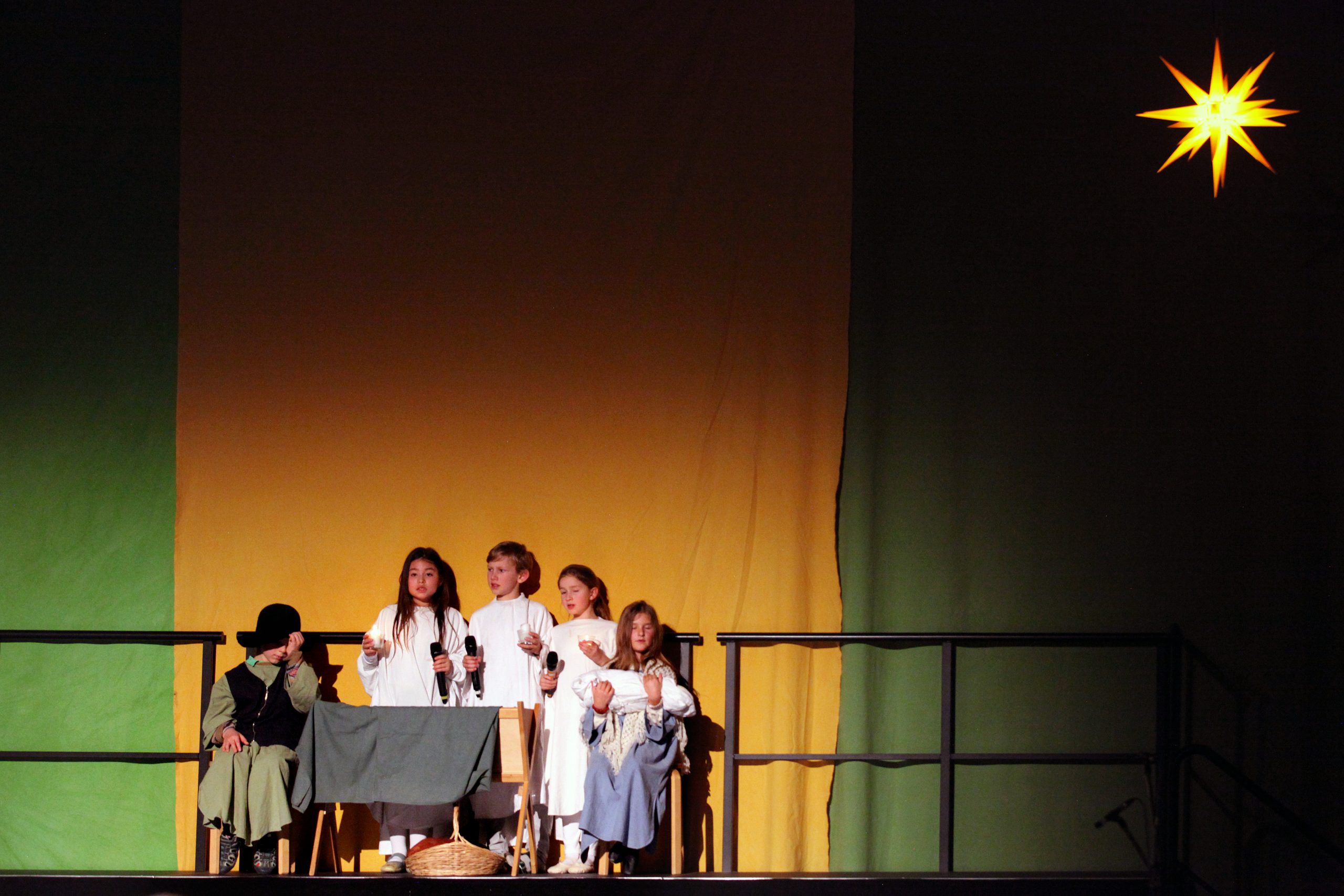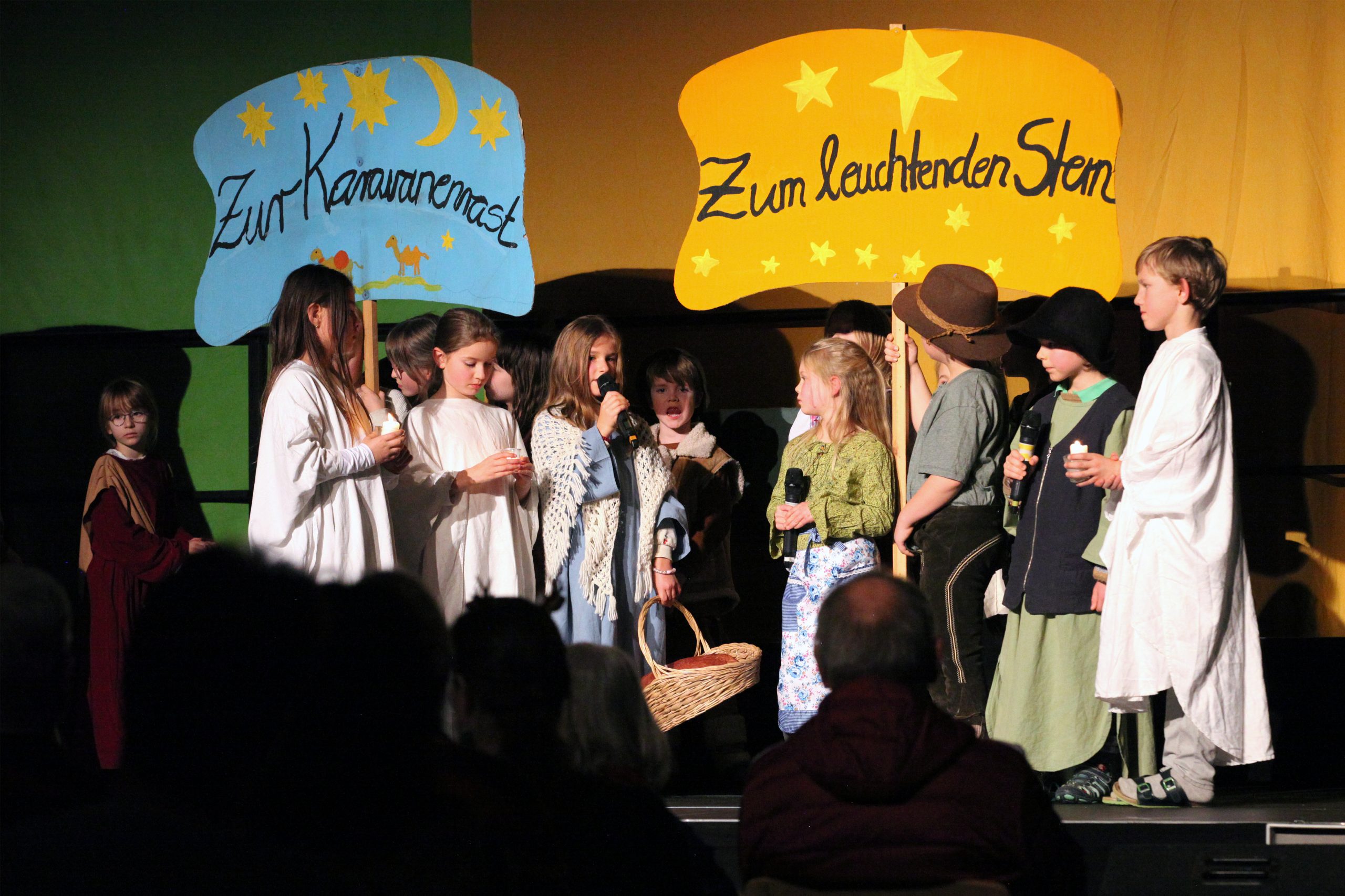 Die Jüngsten der Schule erzählten die alte Geschichte von der Geburt Jesu und waren als Bewohner von Nazareth, als Wirtsleute und Reisende in Betlehem oder als Engel und Hirten verkleidet. Maria sang ihr Lied „Ach ich kann nicht mehr“ und Josef klopfte an die Türen der Herbergen an. Jedes Kind hatte sich auf seine Rolle prima vorbereitet und überwand die Aufregung, vor solch einem großen Publikum zu spielen.