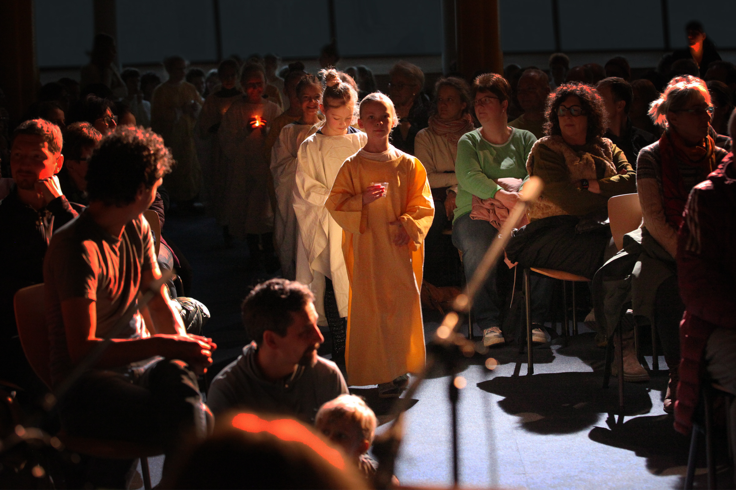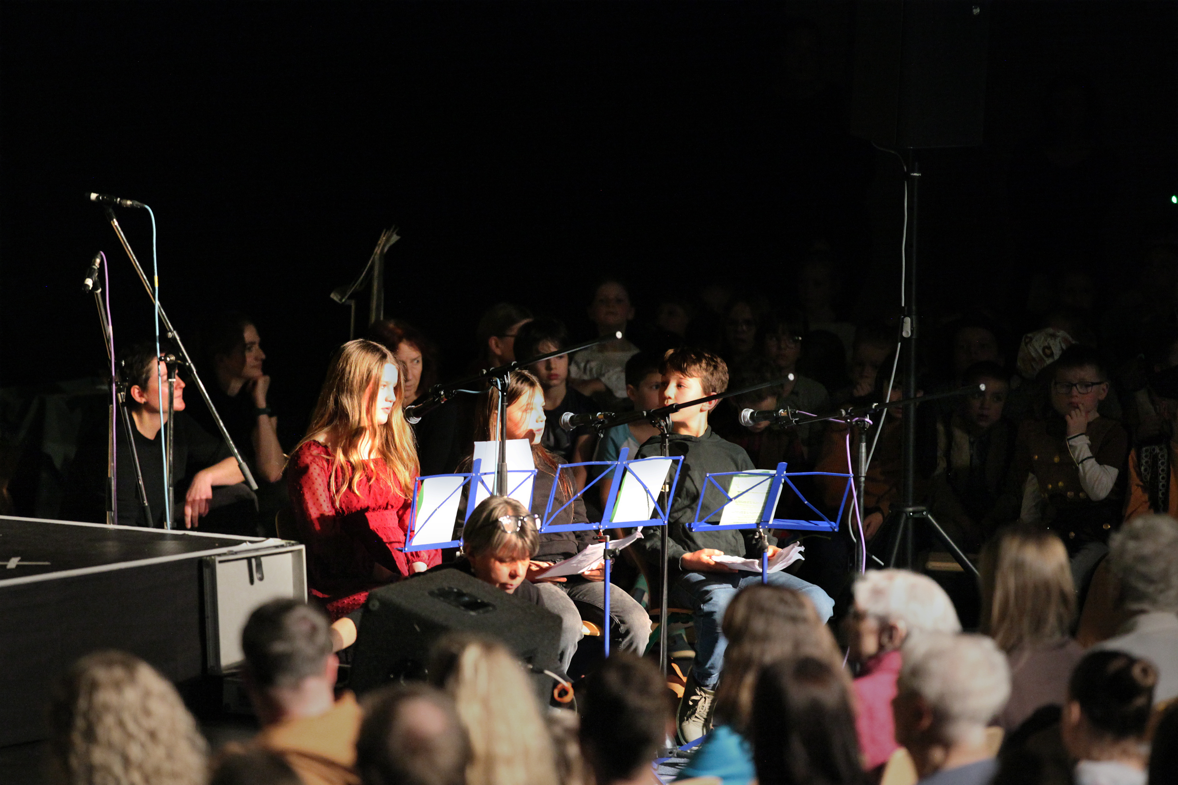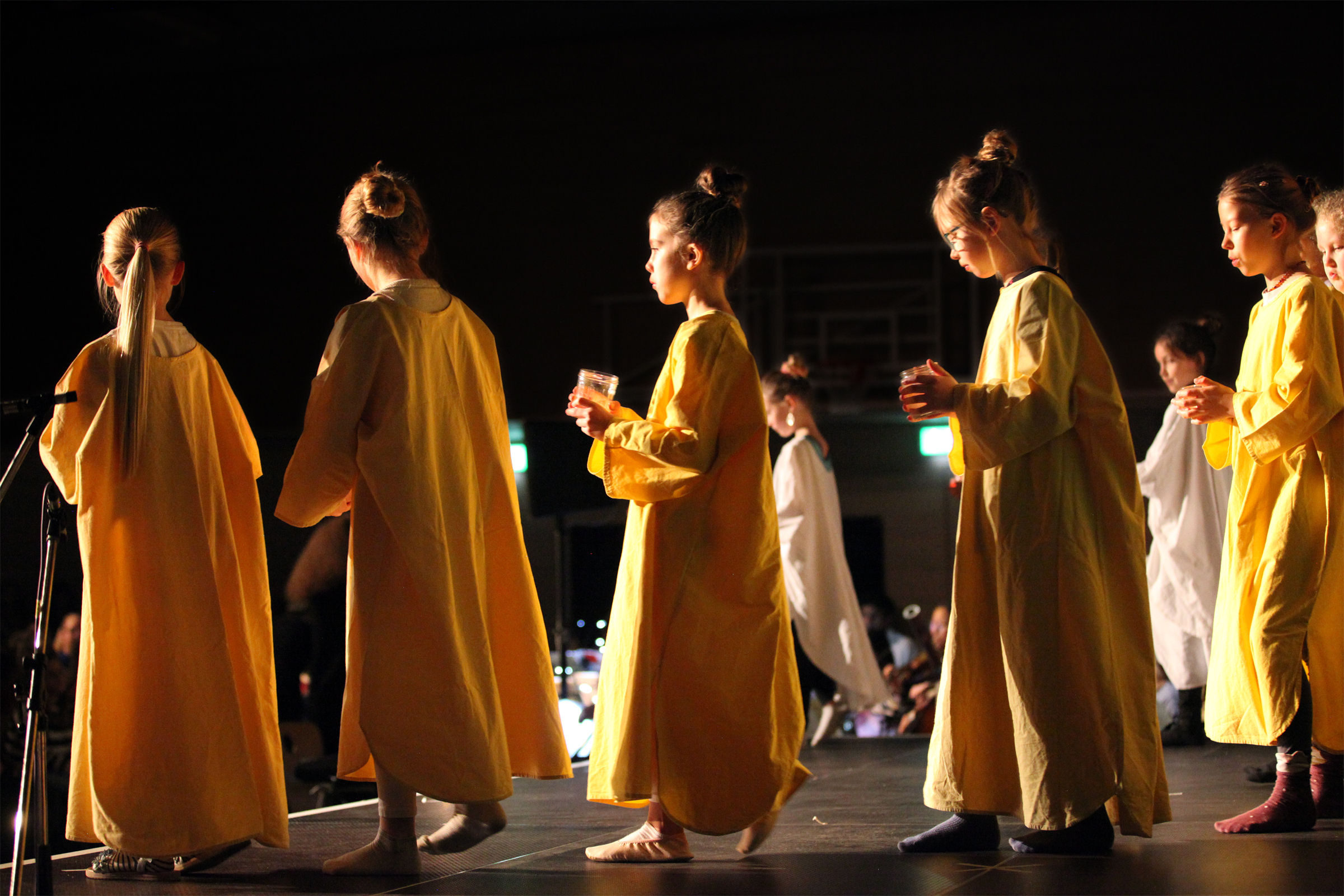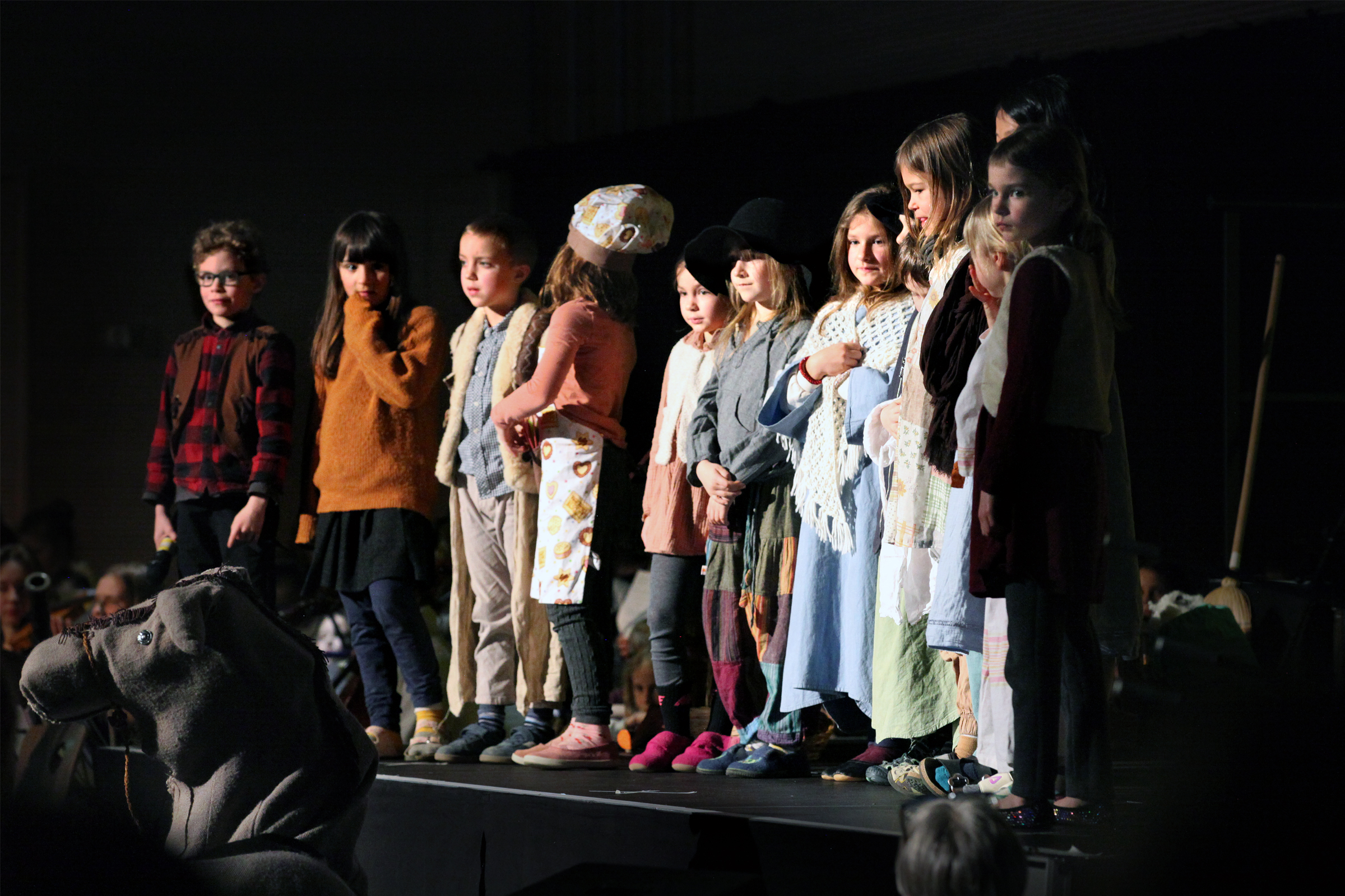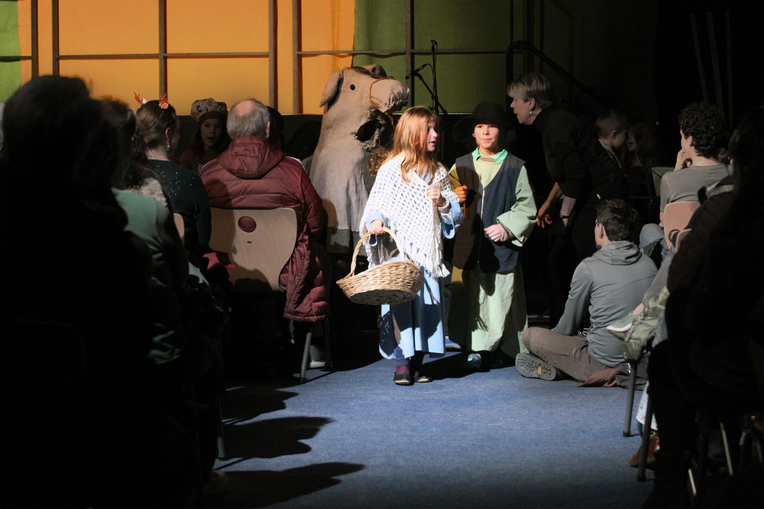 Die Jüngsten der Schule erzählten die alte Geschichte von der Geburt Jesu und waren als Bewohner von Nazareth, als Wirtsleute und Reisende in Betlehem oder als Engel und Hirten verkleidet. Maria sang ihr Lied „Ach ich kann nicht mehr“ und Josef klopfte an die Türen der Herbergen an. Jedes Kind hatte sich auf seine Rolle prima vorbereitet und überwand die Aufregung, vor solch einem großen Publikum zu spielen.