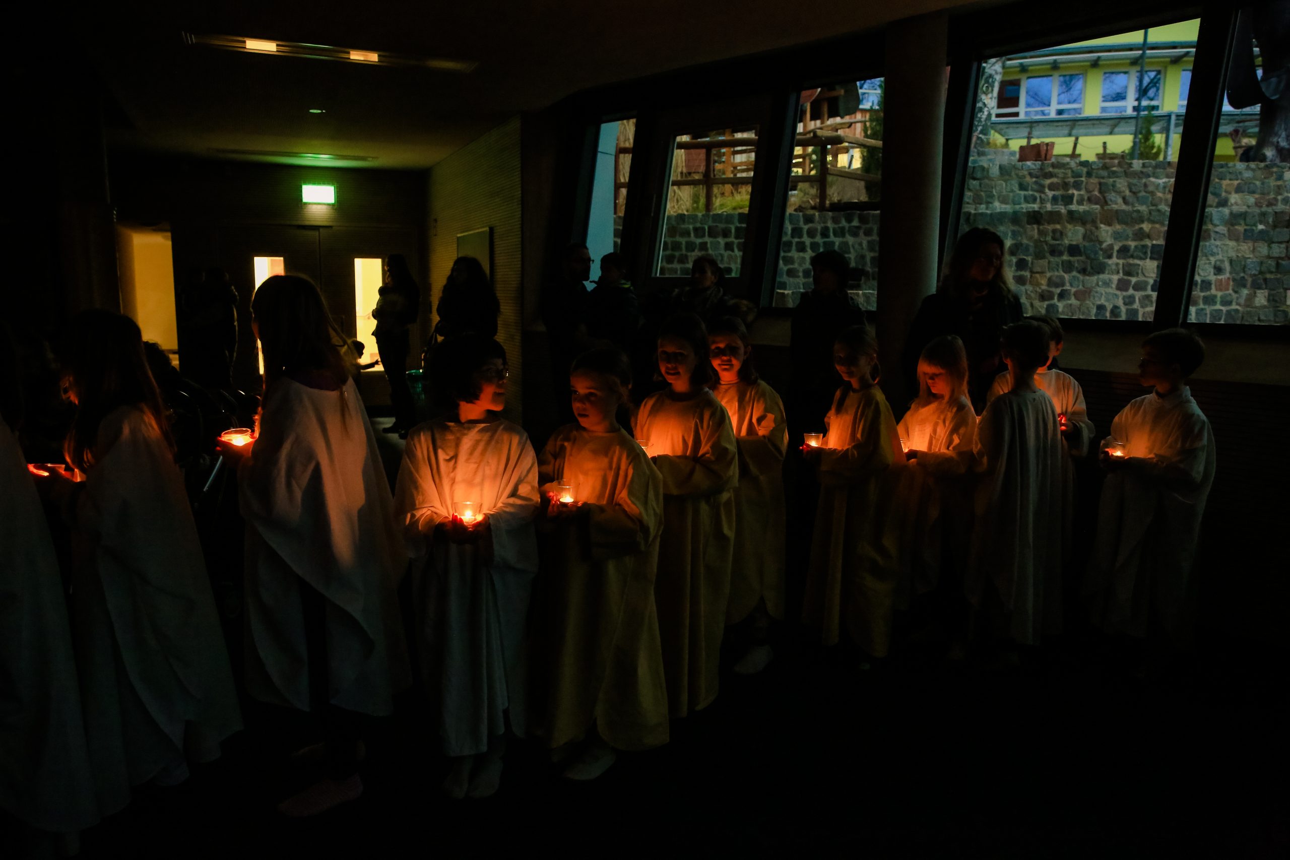 Die vielen Mitwirkenden waren ganz aufgeregt und freuten sich gleichzeitig darauf, die Geschichte zu erzählen. Ob beim Lichtertanz, in der Rahmengeschichte, die von der Idee des Franziskus berichtete, die Weihnachtsgeschichte den Menschen vorzuspielen, im Krippenspiel, im Chor oder Orchester – sehr viele Schüler*innen der Jahrgänge 1 – 13 brachten sich ein. So wurde die Adventsfeier für alle, die dabei waren, ein Erlebnis. So einige Lieder klangen sicher bei vielen auf dem Nachhauseweg noch nach.