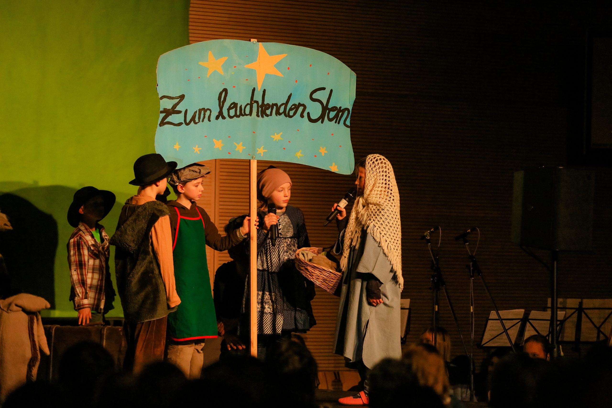 Nach dem Besuch des kleinen Weihnachtsmarktes in der Rotunde des Schulhauses, bei dem man sich an Plätzchen und Punsch erfreuen oder noch kleine Geschenke am Keramikstand erwerben konnte, strömten die Zuschauer*innen zur Aufführung.