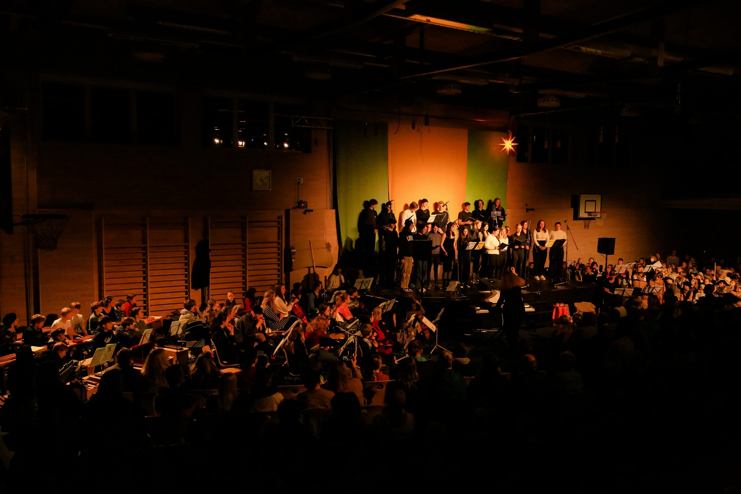 In diesem Jahr fand die Adventsfeier sogar in der Mehrzweckhalle der Schule statt. Viele Helfer*innen haben dafür gesorgt, dass dieser Raum in eine weihnachtliche Stimmung versetzt werden konnte.