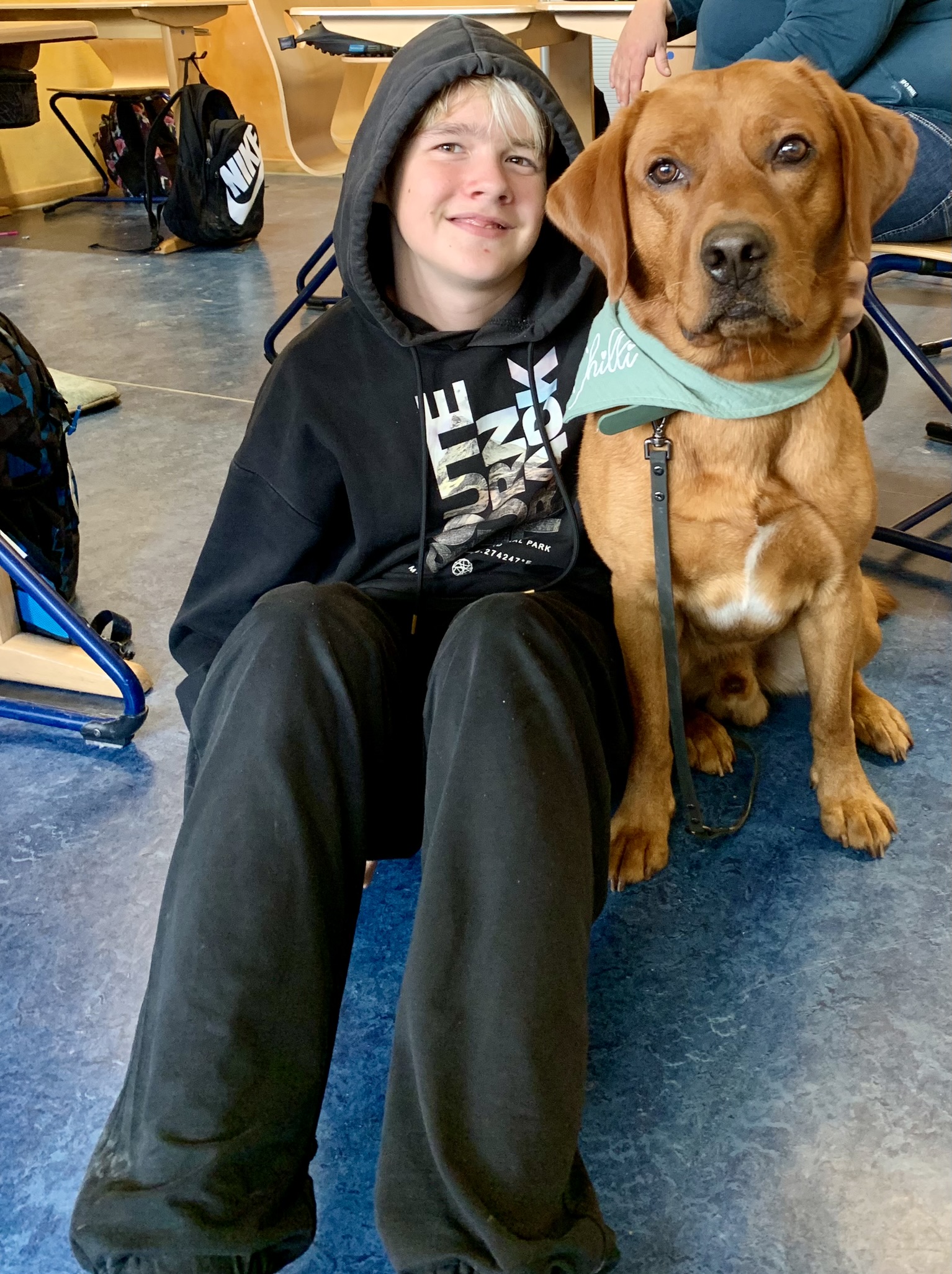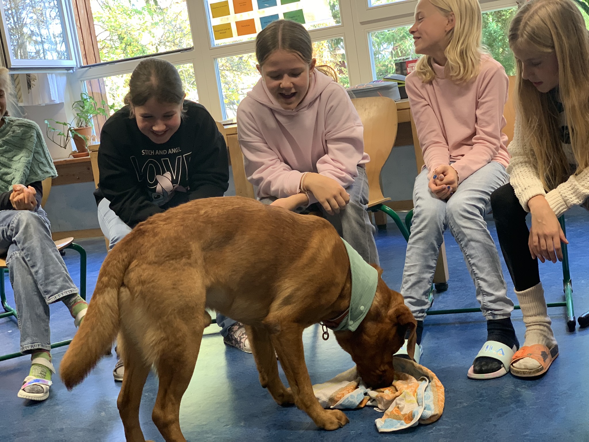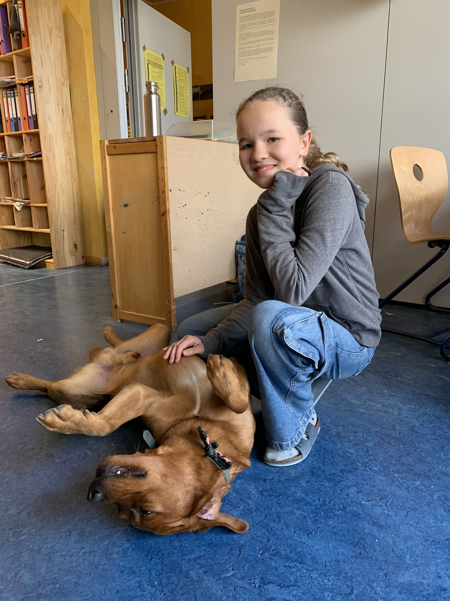 Der vierjährige Labrador Retriever absolvierte im vergangenen Jahr zusammen mit mir die Ausbildung zum Therapiebegleithunde-Team in der Ausbildungsstätte „Servicehunde Mitteldeutschland“ in Erfurt. In dieser Zeit besuchte er bereits regelmäßig unsere Schule, in der er nach anfänglicher Gewöhnung immer selbstverständlicher ein Bestandteil der Gemeinschaft wurde.