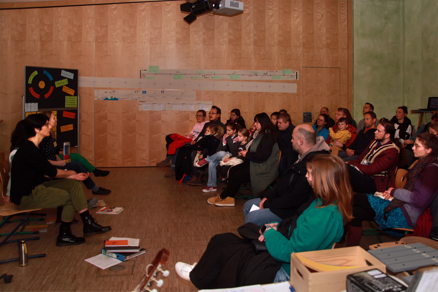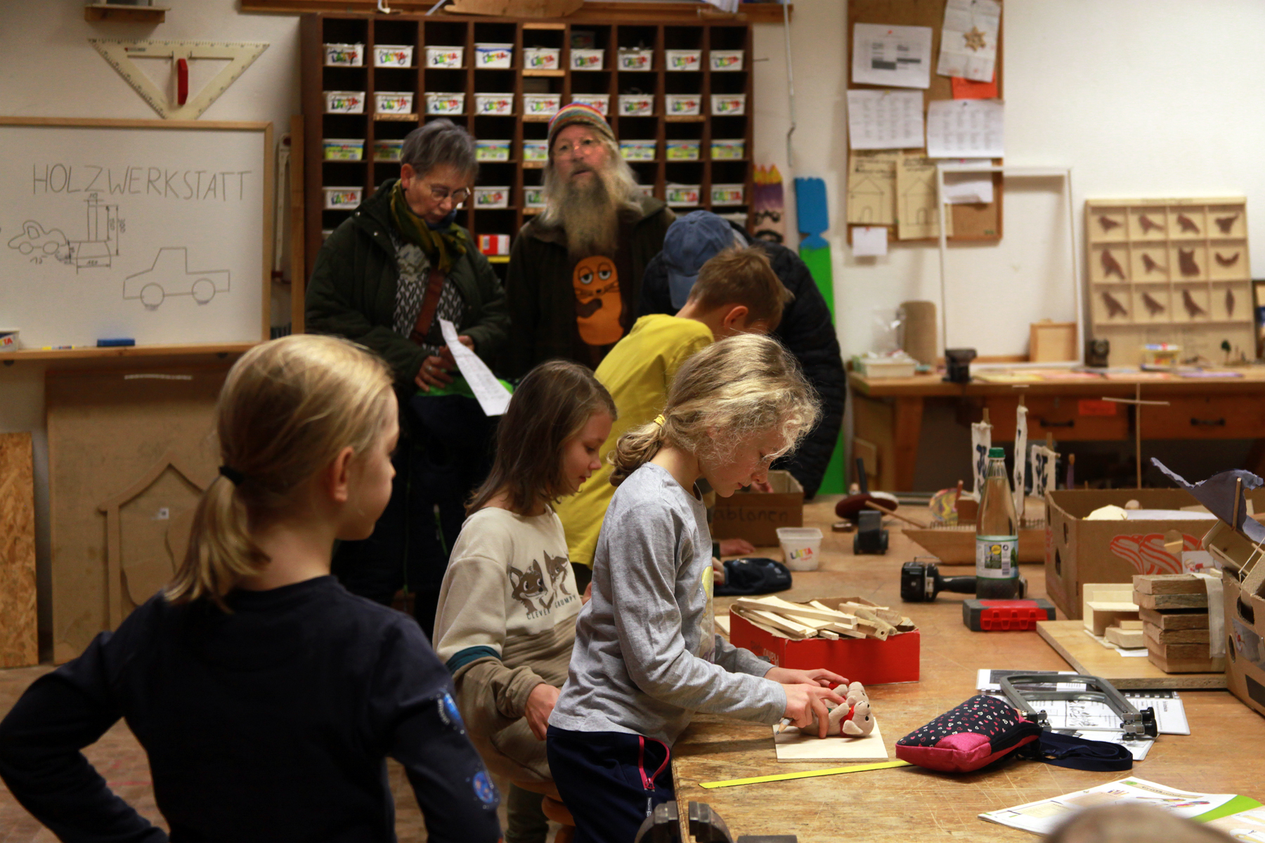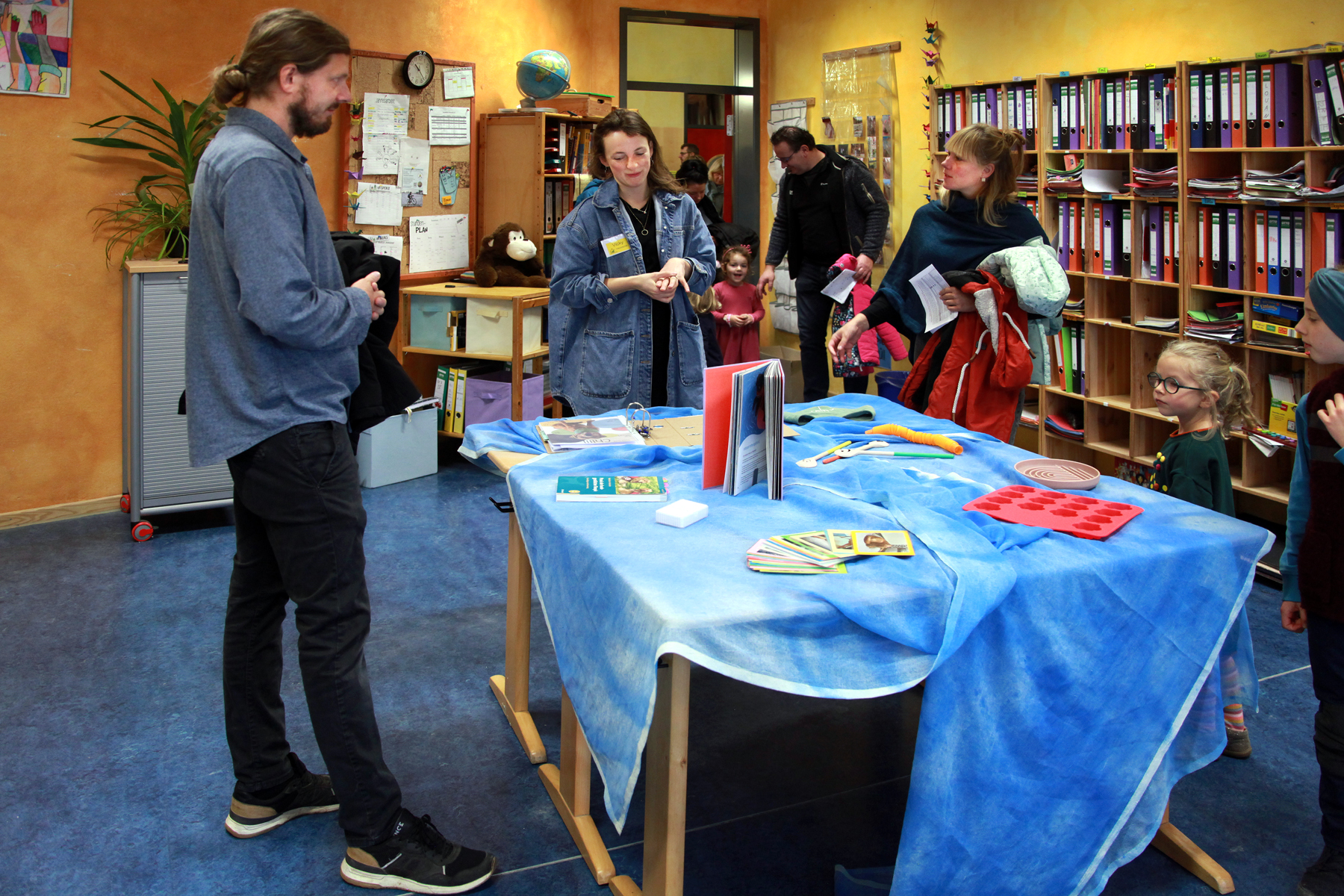 Kleine wie größere Kinder waren eifrig beim Werkeln in der Holz-, Keramik- Textil oder Naturwerkstatt, tobten sich bei einer Hofrally oder in der Mehrzweckhalle aus, während die Eltern den Vorträgen zum Schulkonzept lauschten und ihre Fragen stellen konnten. In den Stammgruppenräumen  kam man mit den Pädagog*innen ins Gespräch und erfuhr dabei einiges über die Arbeitsmaterialen, die wir beim Lernen einsetzen.